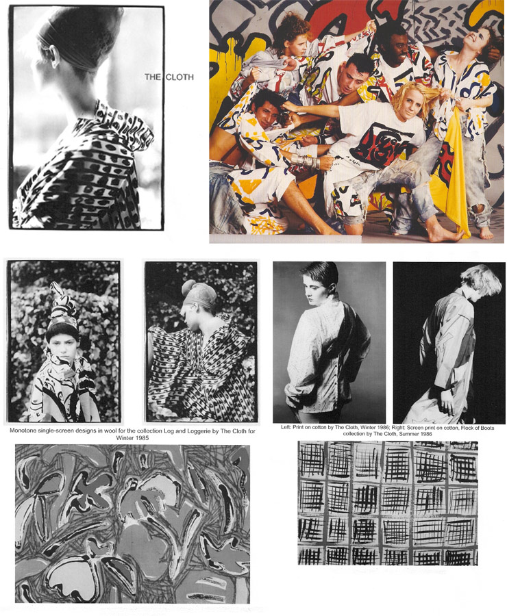 While at the Royal College, Manning Clark co-founded the interdisciplinary design group “The Cloth” with colleagues Fraser Taylor, Brian Bolger and David Band. The Cloth specialized in strong, painterly textile designs as well as group and solo painting exhibitions. The group designed textile collections for clients such as Paul Smith, Betty Jackson, Yves Saint Laurant, Calvin Kline and Nicole Miller, selling work and exhibited extensively in New York, Japan, Paris, London and Italy. They produced their own clothing collections which sold in major stores including Saks Fifth Avenue, Harrods and Liberty of London, and across Europe, America and Japan. Textiles designed by The Cloth were also acquired by the V&A in London to add to their permanent collection, and more recently many pieces have been acquired by Glasgow School of Art and the Art Institute of Chicago in the USA for their archives.